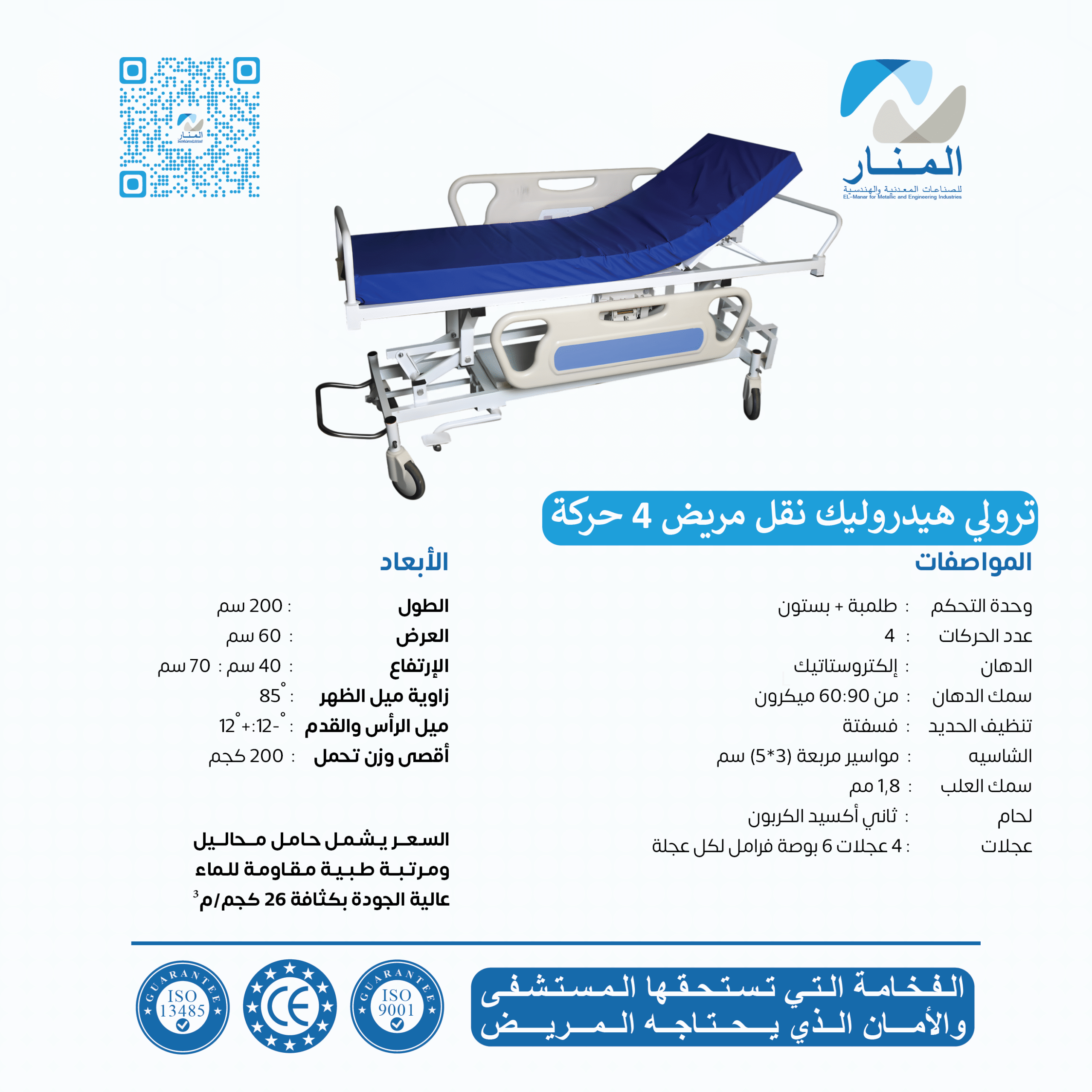 يعتمد الترولي على نظام هيدروليكي (طلمبة + بستون) يوفّر تحكمًا سلسًا ودقيقًا في الارتفاع والزوايا، مما يساعد الطاقم الطبي على نقل المرضى بكفاءة وأمان.