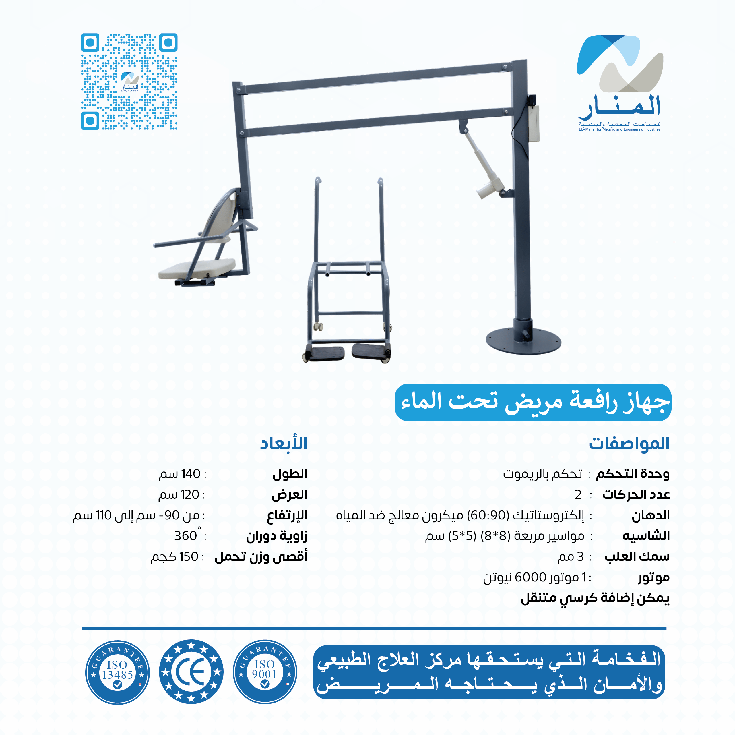 يُعد جهاز رافعة المريض تحت الماء من الأجهزة الأساسية داخل مراكز العلاج الطبيعي والعلاج المائي (Hydrotherapy)، حيث يُساعد على رفع المرضى وإنزالهم داخل حوض الماء بسهولة وأمان، دون أي مجهود بدني من المعالج أو خطر على المريض.