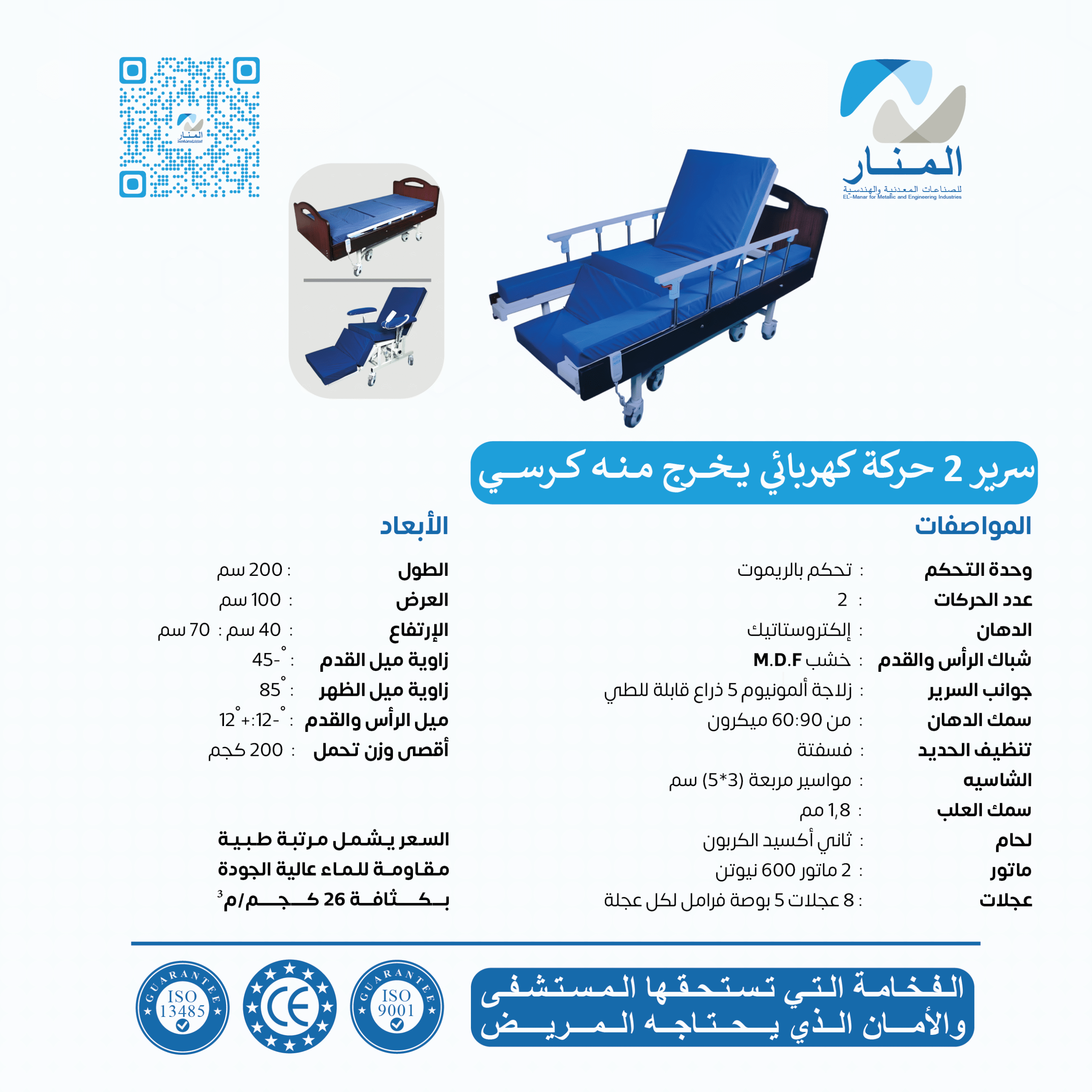تم تصميم السرير ليحقق التوازن بين الراحة للمريض وسهولة الاستخدام للمرافق، مع الحفاظ على أعلى معايير المتانة والسلامة.