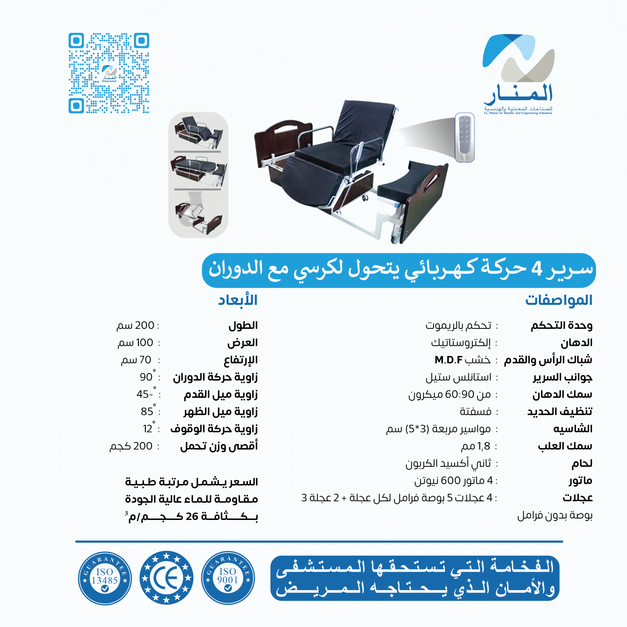 سرير طبي منزلي 4 حركة كهربائي يتحول لكرسي مع الدوران
