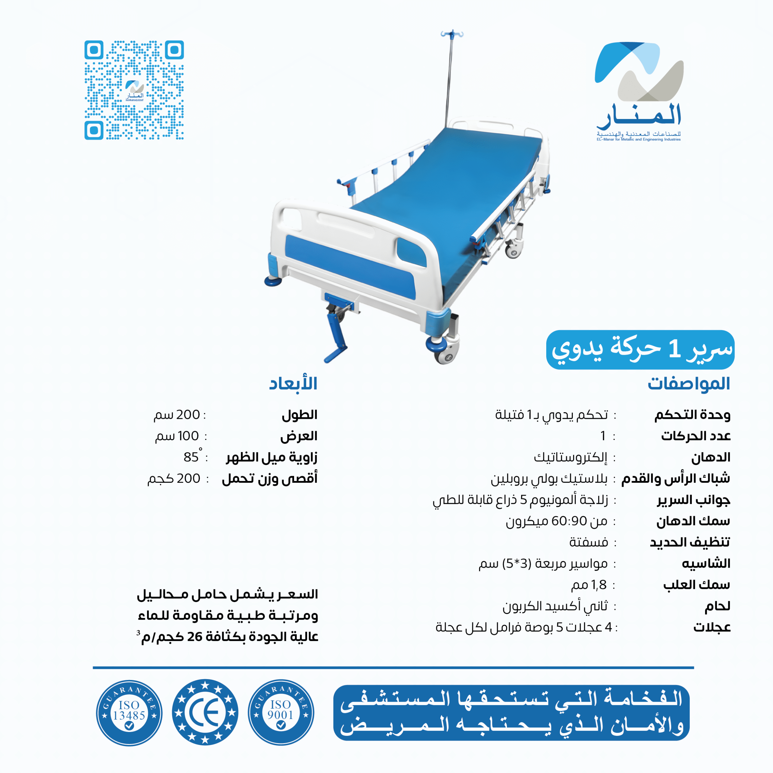 يُعد السرير الطبي اليدوي 1 حركة من الخيارات المثالية للاستخدام المنزلي والمستشفيات، حيث يجمع بين البساطة، المتانة، وسهولة التشغيل بتكلفة اقتصادية.