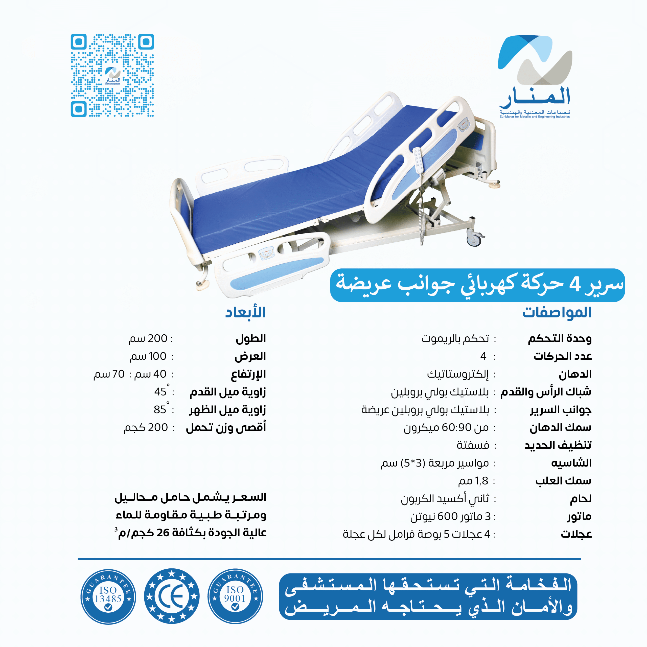 يُعتبر السرير الطبي الكهربائي 4 حركة جوانب عريضة الخيار الأمثل لكل من يبحث عن راحة كاملة للمريض وسهولة استخدام الطاقم الطبي، سواء للاستخدام المنزلي أو داخل المستشفيات والمراكز الصحية.