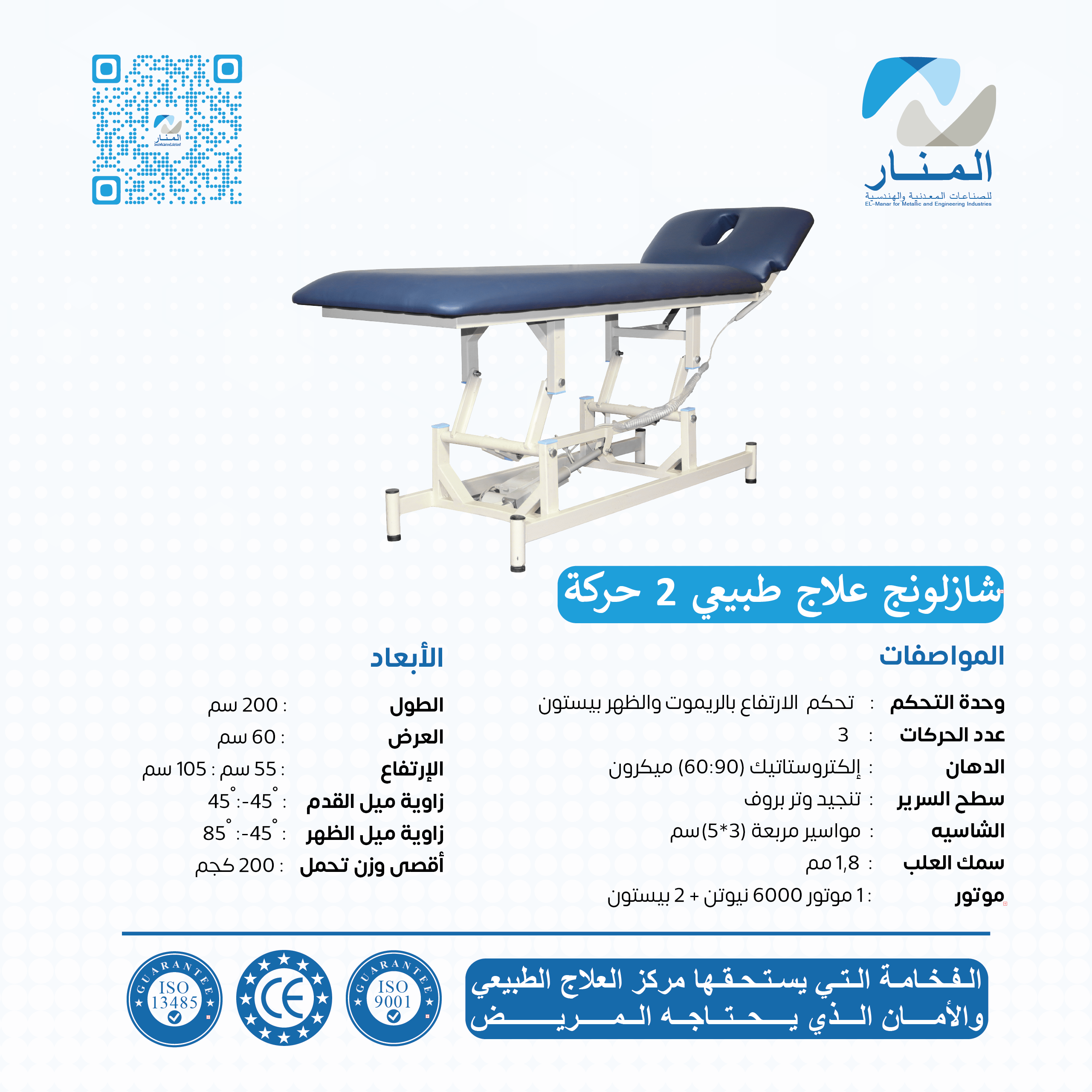 يُعد شازلونج العلاج الطبيعي الكهربائي 2 حركة من أكثر المنتجات طلبًا داخل مراكز العلاج الطبيعي والتأهيل الحركي، لما يتمتع به من تصميم عملي مريح للطبيب والمريض على حد سواء.